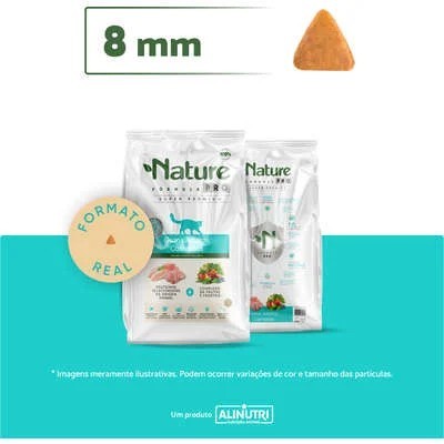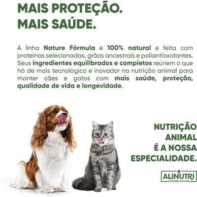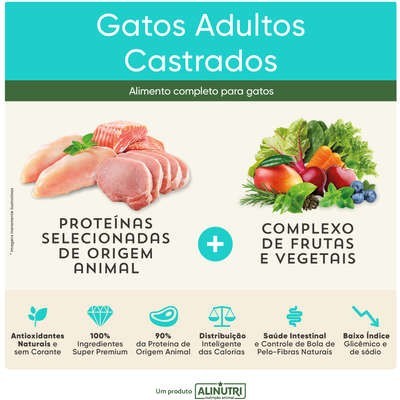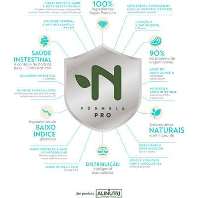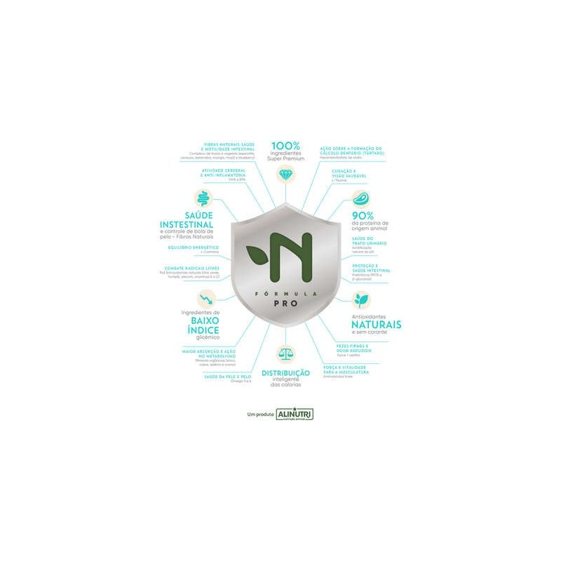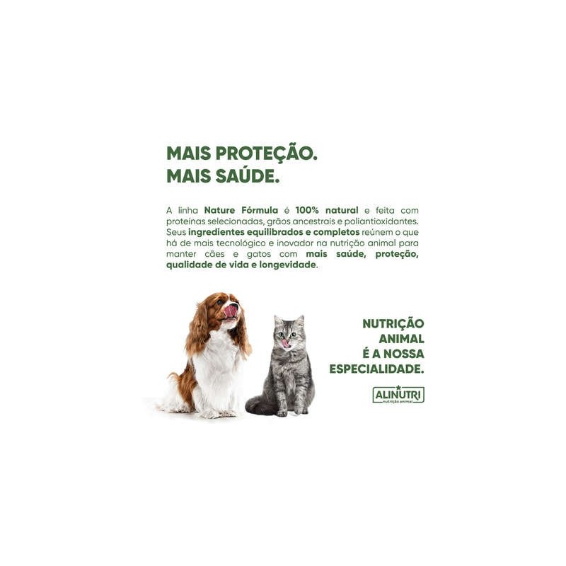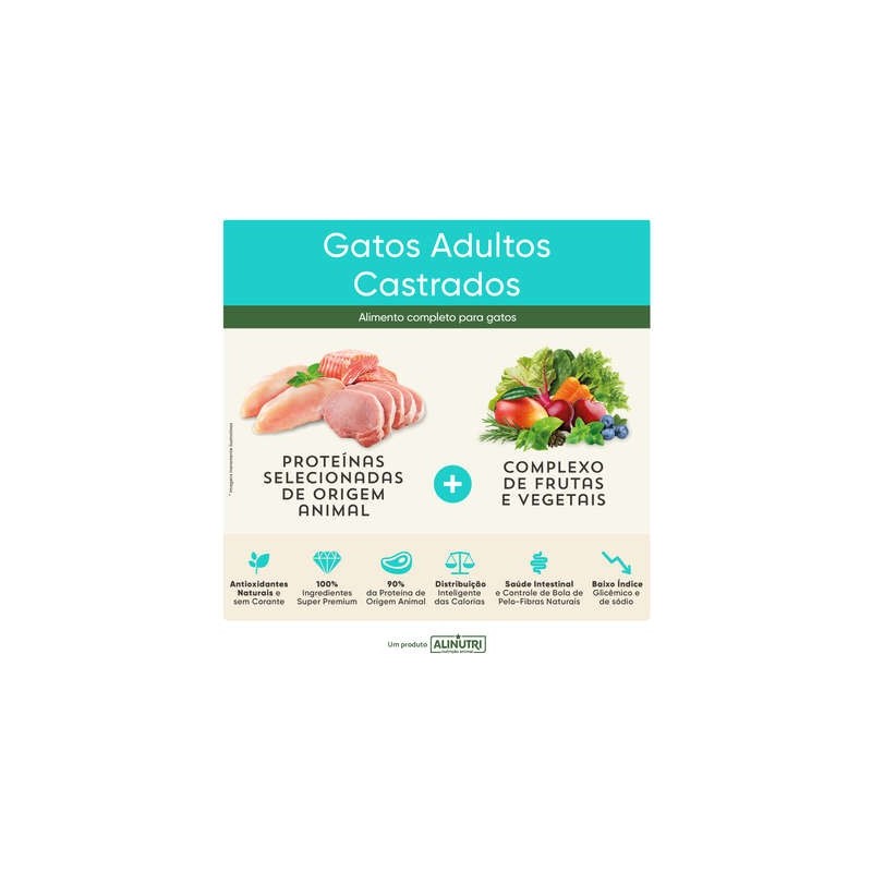 - Com blend de carnes: seleção de proteínas (frango, peixe e suíno) para maior aceitação, digestibilidade e variedade de aminoácidos;